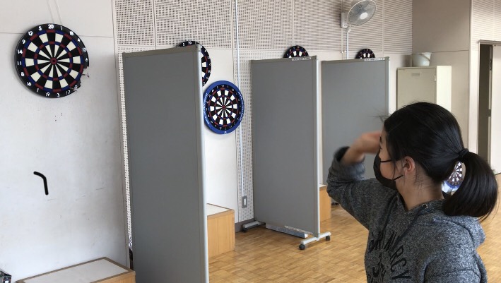 1回目はクラブ活動の目標を決めました。今年度も目標は『ブルを目指してみんなで楽しくダーツをしよう』です。そこで、点数や勝敗にかかわらずブルに入ったらシールを貼るようにしてきました(インナーは青、アウターは赤)。成果が目に見えるので、ブルを狙う意欲付けになりました。また、広瀬晴香プロに来校していただき、良い投げ方を直接見ることで、ボールとは違う「ダーツを投げる」イメージをつけることができました。
